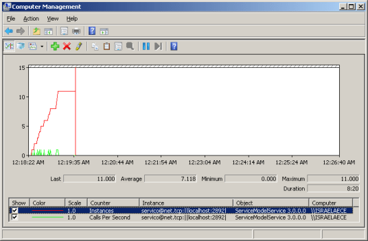 Como eu comentei aqui, o WCF fornece vários contadores de performance que você pode utilizar para monitorar os serviços. Há vários tipos de contadores, que mensuram pontos cruciais de toda a infraestrutura do WCF. A imagem abaixo ilustra o monitoramento das instâncias (das classes que representam o serviço) que são criadas, e a quantidade de chamadas por segundo.