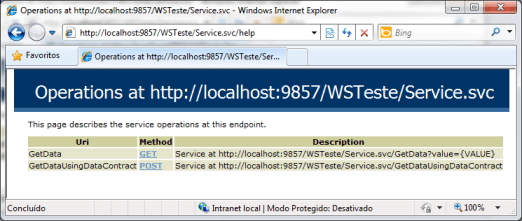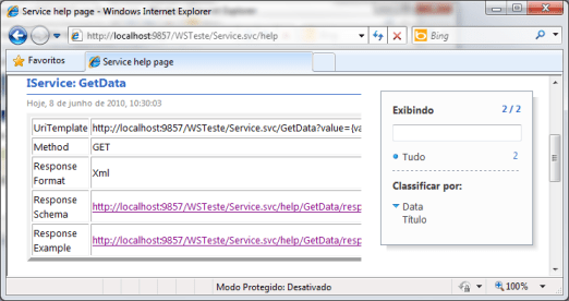A finalidade do artigo é abordar como resolveremos o segundo problema, ou seja, a exposição das informações pertinentes à documentação, ou melhor, à descrição do serviço. A primeira opção para expor isso, é utilizando o behavior WebHttpBehavior, que expõe uma propriedade chamada HelpEnabled, que quando definida como True, exibe uma página em formato HTML, com todas as operações que o serviço possui, e com exemplos de como invocar cada uma delas. Abaixo temos o código (declarativo) necessário para habilitar este recurso, e em seguida, temos a imagem que corresponde a página gerada automaticamente: