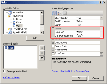 Para configurar os valores no controle GridView clique na Smart Tag do mesmo e selecione Edit Columns. Em seguida, clique em cima da coluna que deseja formatar e a propriedade DataFormatString será exibida no painel do lado direito, como é exibido na figura abaixo: