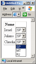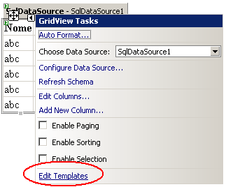 Com esta coluna adicionada no controle GridView podemos, através da Smart Tag, editar esta coluna e assim customizar de acordo com a necessidade. O cenário que utilizaremos é incluir em cada linha do controle GridView que contém os registros provenientes de uma DataSource adicionando um controle DropDownList com alguns dos estados do Brasil. Vejamos abaixo o passo à passo para realizar esta tarefa: