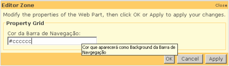 O atributo WebDisplayName definirá o nome (label) da propriedade que será exibido que, por padrão, é o próprio nome da propriedade. Já o WebDescription serve para definirmos uma pequena mensagem (tooltip) quando o usuário posiciona o mouse em cima do controle responsável por alterar a propriedade. Finalmente o atributo Personalizable, que garantirá que o valor atribuído a propriedade será persistido no repositório de dados especificado através do provider. É importante dizer que somente a propriedade de escrita e leitura são permitidas, e qualquer outro tipo de propriedade, incluindo as parametrizadas, resultarão em uma excessão do tipo HttpException. A imagem abaixo ilustra o controle em funcionamento: