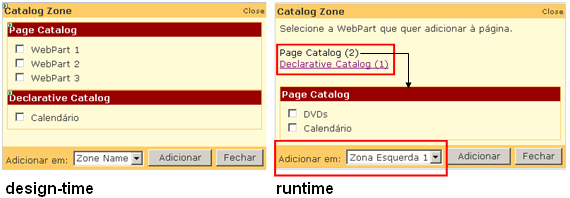 Através do comparativo que a imagem abaixo mostra, vemos que a zona que contém os catálogos cria links para os catálogos que temos em seu interior, ou seja, como temos o DeclarativeCatalogPart e PageCatalogPart há dois links em que, quando clicados, listam as respectivas WebParts. No rodapé da zona de catálogos temos um controle do tipo DropDownList que contém todas as zonas da página corrente em que podemos adicionar as WebParts que estão nestes catálogos. Depois de selecionada a zona e a(s) WebPart(s) (através do CheckBox) que desejamos adicionar, basta clicar no botão Adicionar.