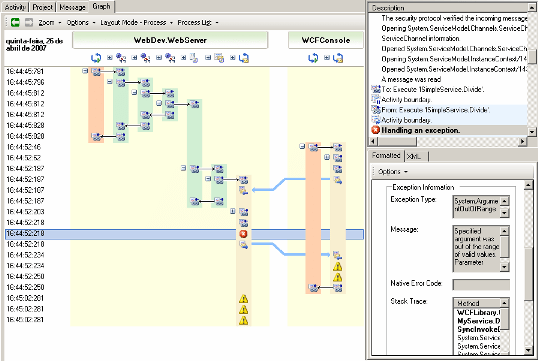 Se analisarmos a figura acima, podemos reparar que eu optei por mostrar de forma gráfica todo o processo. Logo na parte superior do gráfico é possível visualizar os processos (cliente e servidor) que fizeram parte da requisição para o serviço. Neste mesmo gráfico ainda é possível analisarmos exatamente o momento da criação do proxy, do host e, o principal, do momento onde a exceção ocorre, que é onde o cursor está posicionado. Ainda a respeito do gráfico, cada um dos ícones que ali consta representa uma determinada ação e, para maiores detalhes sobre cada um deles, consulte este documento.