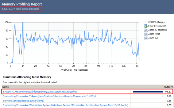 Além disso, o método Buscar efetua a leitura do – mesmo – arquivo a cada requisição que chega para o mesmo, ou seja, recupera o conteúdo do arquivo e armazena em uma variável (array) local, e logo em seguida, efetua a busca em cima da mesma. Para tentar diagnosticar eventuais pontos de alocação de memória, podemos recorrer ao monitor do tipo .NET Memory Allocation, que tem justamente essa finalidade. Se rodarmos o mesmo em cima do serviço que criamos na primeira parte desta série, o resultado será mais ou menos o que é demonstrado abaixo: