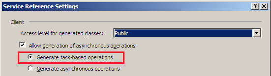 Já o consumo por parte de uma aplicação também .NET, temos uma ligeira mudança. Trata-se de uma nova opção chamada “Generate task-based operations”. Ao efetuar a referência para um serviço e se esta opção estiver selecionada, fará com que a versão assíncrona das operações do proxy, sejam criadas utilizando o modelo baseado em tasks. Enquanto a outra opção, fará com que ele crie no modelo tradicional, ou seja, baseado em eventos XXXCompleted para cada uma das operações expostas pelo serviço. A imagem abaixo ilustra esta nova opção: