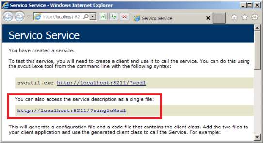 Já na versão 4.5 do WCF, a Microsoft já trará isso nativamente, ou seja, a criação do serviço continua a mesma, só que podemos acessar o endereço que expõe o WSDL, anexando na querystring o sufixo ?singleWsdl, o que fará com que o documento WSDL gerado, incluia toda a informação necessária, sem referências para arquivos externos. Abaixo temos uma imagem quando acessamos este serviço no navegador. Note que há um link na página que já aponta para este novo recurso.