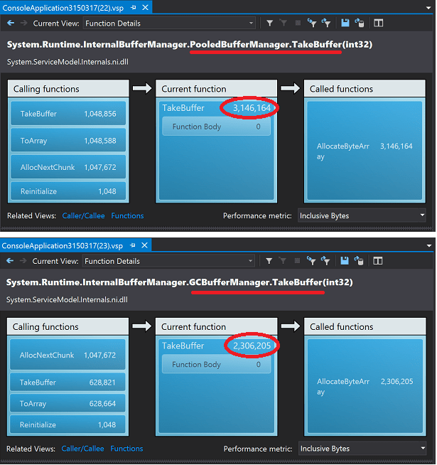 Se criarmos um pequeno exemplo de um serviço que retorna uma coleção de objetos (5000), podemos perceber no resumo do profiler que foi aplicado à execução, uma diferença significativa da quantidade de bytes que foram alocados quando utilizamos a propriedade MaxBufferPoolSize com valor diferente de zero e com valor igual a zero.