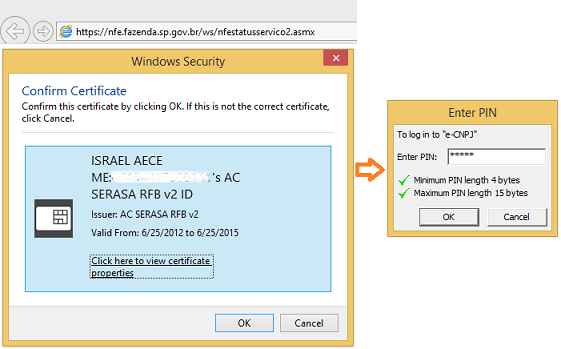 Uma vez que a configuração está concluída, podemos acessar o serviço e visualizarmos o retorno. Note que o código C# nada sabe sobre as configurações de certificado. É importante ressaltar que como este certificado tem um PIN, um prompt irá aparecer automaticamente para a digitação do mesmo. Na sequencia é possível visualizar o resultado que foi devolvido pelo serviço.
