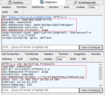 Por fim, ao monitorarmos as requisições via Fiddler, podemos perceber a conexão sendo criada entre as partes, e tudo isso é definido através de headers no cabeçalho das mensagens, conforme notamos na imagem abaixo. Os primeiros que nos chamam a atenção são o header Connection e Upgrade, que indica ao servidor que a conexão deve ser migrada para WebSockets. Na sequencia temos o header Sec-WebSocket-Key, que trata-se de um hash gerado e codificado em Base64, que em conjunto com o header de resposta chamado Sec-WebSocket-Accept, previnem um ataque conhecido como “cross-protocol attack”, e garantem a conexão estabelecida e que as mensagens já podem ser trocadas.