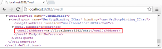 Ao rodar o serviço e analisar os metadados no navegador, veremos que o endereço possui um novo scheme chamado “ws”. Nós podemos utilizar tanto o “http” quanto o “ws”. Ao referenciar o serviço através da opção “Add Service Reference” em uma aplicação cliente, o WCF já faz a configuração utilizando o “ws”, conforme podemos ver no trecho extraído do arquivo de configuração.